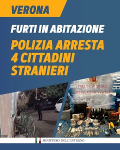 E per non restare nel vago, il Ministro Piantedosi, nella giornata di ieri, 04 gennaio 2026, ha scritto: “Sono stati arrestati dalla Polizia di Stato a Verona 4 cittadini stranieri, responsabili di furti in abitazione. Le attività di osservazione e controllo nei quartieri colpiti hanno consentito di individuare la banda, attiva soprattutto nelle ore pomeridiane e serali”.