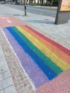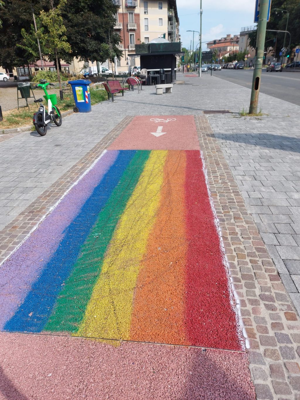In essa Morando segnala come sulla pista ciclabile di corso Umbria, in prossimità del chiosco di corso Umbria 21 e del benzinaio di piazzale Umbria 0, è comparsa una bandiera arcobaleno tracciata sulla pista, di circa due metri di lunghezza e che occupa l’intera sezione ciclabile in larghezza.