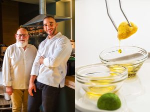 “Mi hanno definito Cuoco delle terre perché della terra e dei suoi frutti sono innamorato da sempre”, racconta lo chef. “Studio ogni elemento vegetale, ne cerco le peculiarità, lo lascio maturare per settimane per arricchirne il sapore e poi lo taglio seguendo la sua struttura, come fosse carne”.