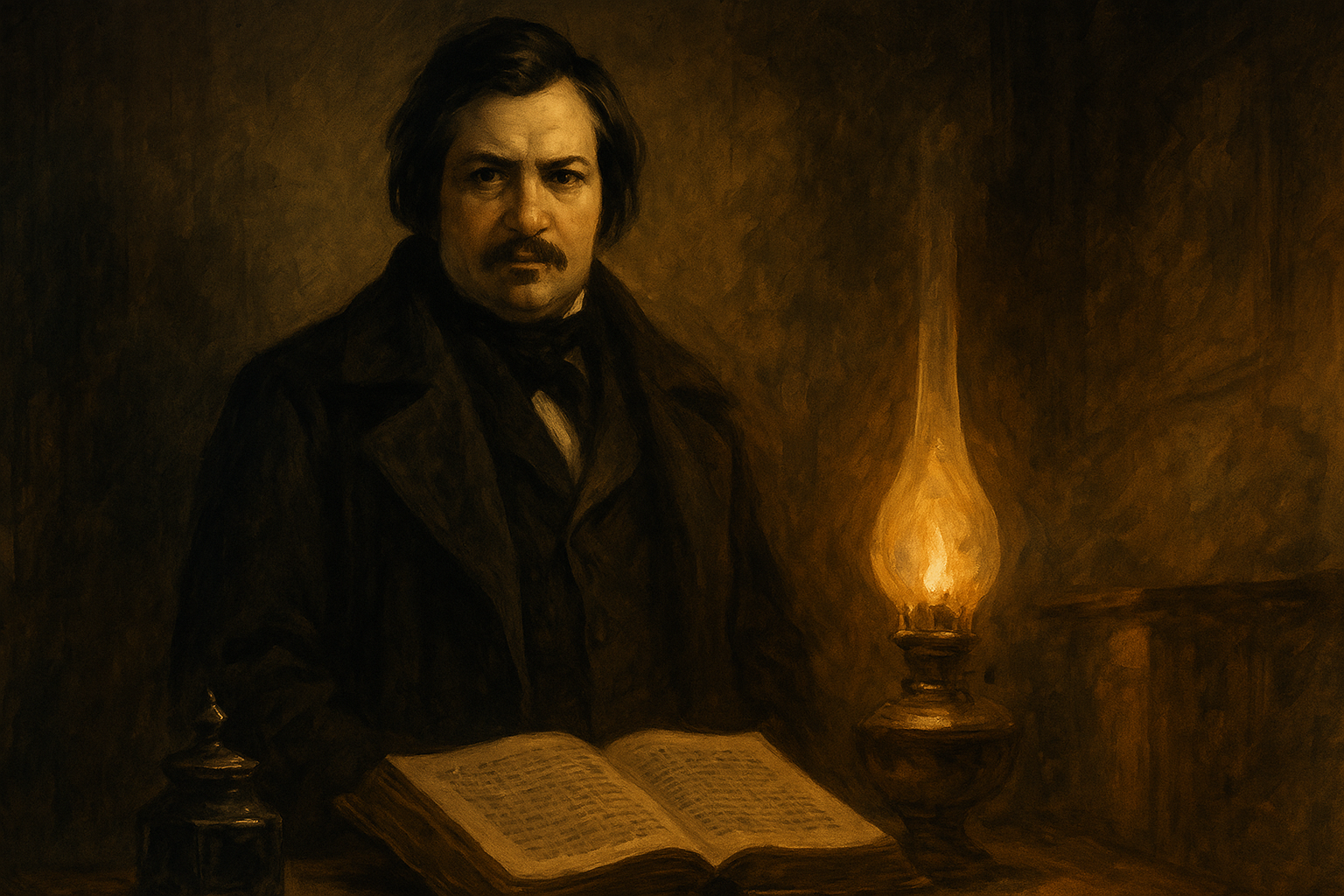 È notte. Il silenzio avvolge la stanza. Sul tavolo, una copia ingiallita de Il cugino Pons è aperta, accanto a un antico calamaio. Il lume a olio proietta ombre tremolanti sulle pareti, e l’aria sembra farsi più densa.