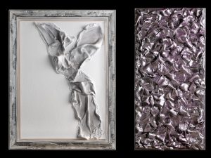 Uso la “tecnica a sbalzo”, una tecnica materica, che prevede l’impiego di tessuti, ceramica, stucco, carta e colla vinilica per ottenere un rilievo che giustifica la definizione “a sbalzo”. La utilizzo per tutte le mie opere.