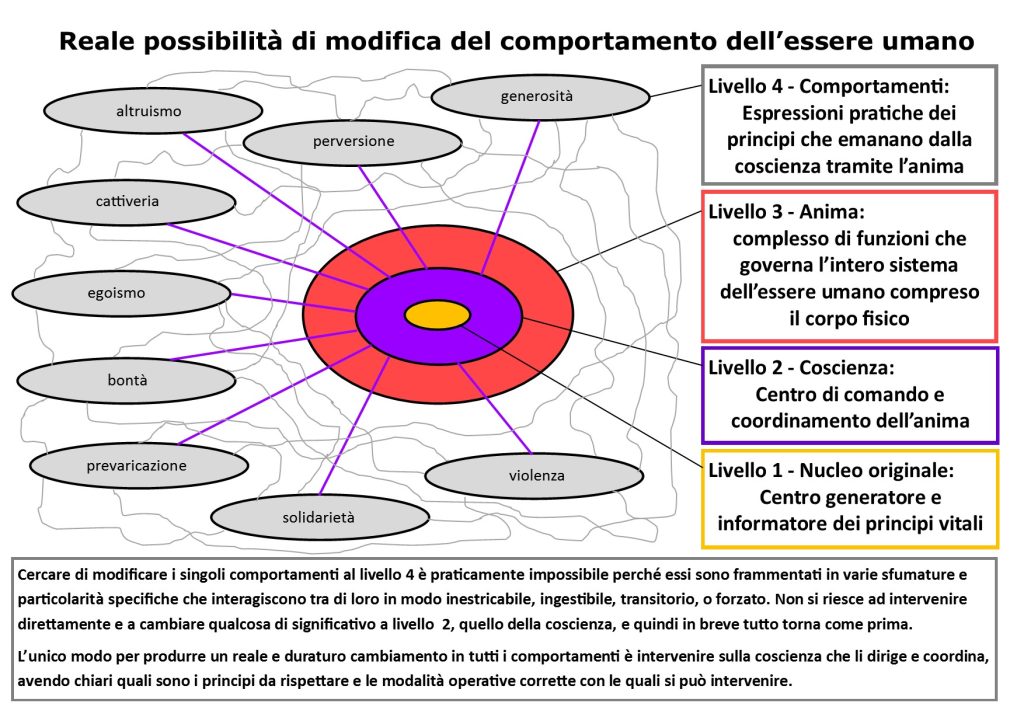 L’unico modo per produrre un reale, duraturo, ed equilibrato cambiamento in tutti i comportamenti, disgiunti o interconnessi, è intervenire sulla coscienza centrale che li dirige e coordina, avendo chiari quali sono i principi da rispettare e le modalità operative corrette per la loro attuazione.