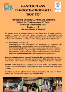 “SOY YO” è la prima Masterclass di tangoteatrodanza ospitata presso la storica fondazione torinese, ed è condotta dalla ricercatrice e operatrice culturale Monica N.Mantelli, che studia dal 1996 gli stilemi espressivi di questa forma iconoclastica. La docente entrerà nel vivo della profondità culturale e comunitaria del tango, grazie ai testi delle Letras de tango e l’eredità culturale di autori come Astor Piazzolla, Horacio Ferrer, Jorge Luis Borges, Meri Lao e molti autori della cosiddetta” Guardia Vieja (la fase iniziale e più arcaica della storia del tango, che si estende approssimativamente dal 1880 al 1920 circa), fino ai tango cançion della fine della Guardia Nueva (1960 circa).