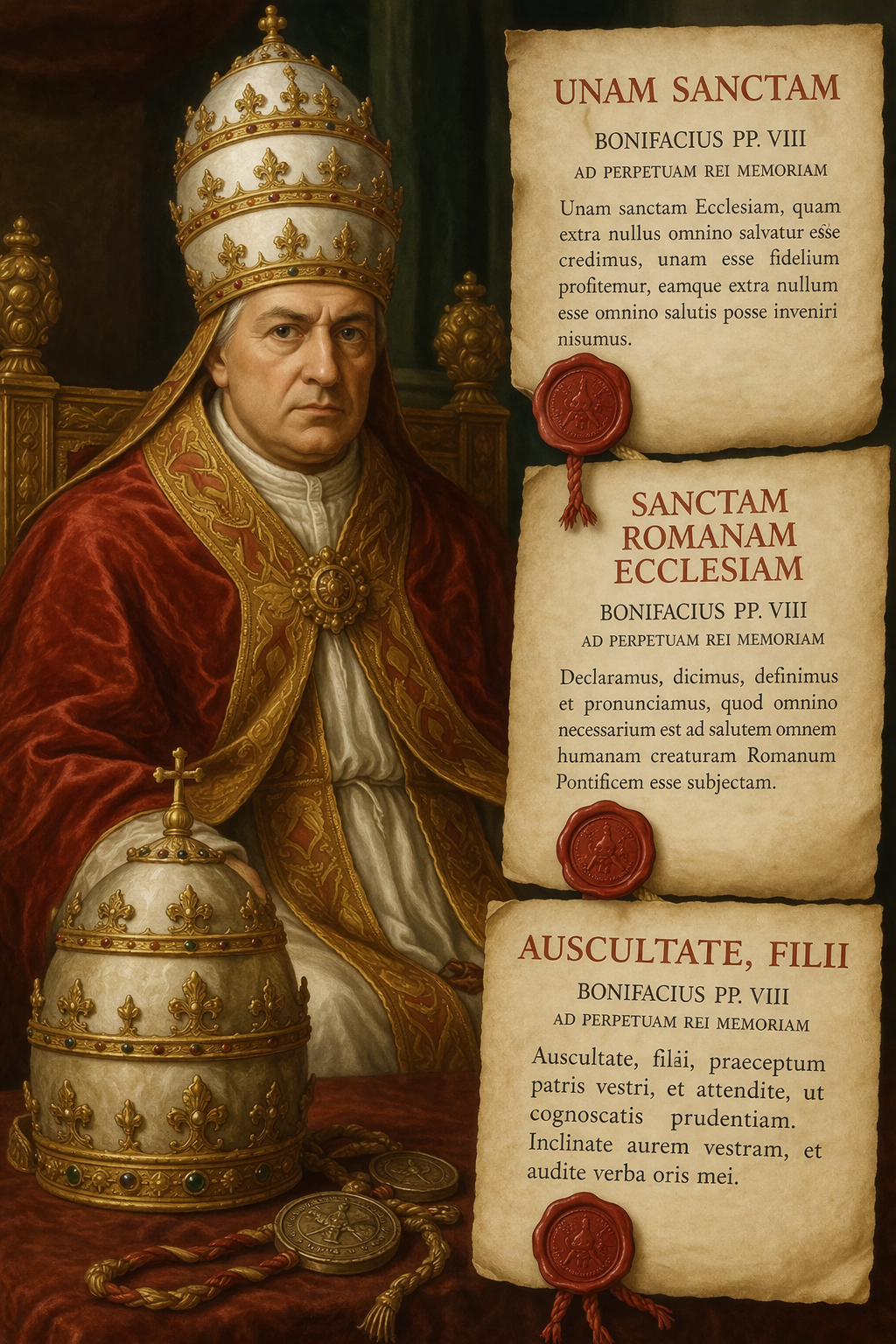 Il primo pontefice che cercò d’imporre questa visione teocratica della realtà, fu il noto papa Bonifacio VIII che con la Bolla Unam Sanctam del 1302 affermò che del potere temporale, unitamente a quello spirituale, doveva essere titolare solo il papa, e che dunque detto potere poteva essere solo delegato ai monarchi. In tal modo anche l’operato dei regnanti poteva essere giudicato dal papa, mentre l’operato del papa non poteva essere giudicato da nessuno, neanche dai monarchi.