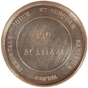 “Di queste sei medaglie che vennero distribuite a ciascuno dei sei condannati in premio della loro opera, e che si rendono rarissime per il loro ristrettissimo numero, Io, Alessandro Ceccarini, Impiegato a’ Musei Pontificii, ho potuto avere quella di proprietà dello Scatizzi, che se ne disfece. Non pochi amatori, desiderosissimi di avere la sunnominata medaglia e fra questi il Principe Sergio di Russia, fecero varie pratiche presso di me, ma io, desiderando che questa medaglia sia vera memoria e documento inconfutabile de’ fatti avvenuti, con vivo sentimento di soddisfazione e di devozione, la offro alla Santità di Leone XIII e ne faccio dono per la collezione storica della epoca moderna…”.