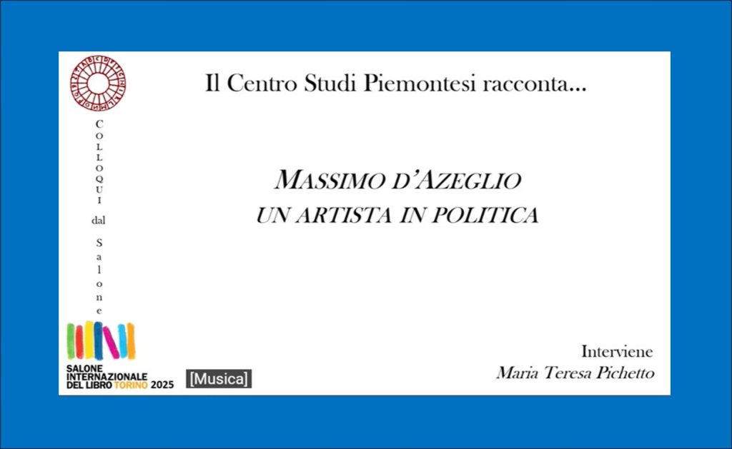 Venerdì 16 maggio 2025 nel Salone Internazionale del Libro di Torino – Lingotto si è tenuto presso lo stand del Centro Studi Piemontesi la presentazione del volume “Massimo D’Azeglio – Un artista in politica” da parte dell’Autrice professoressa Maria Teresa Pichetto. E’ stato un rapido e sintetico excursus biografico in quanto il volume in oggetto è già stato pubblicato da due editori diversi.