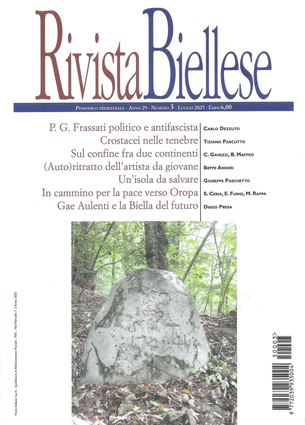 Il terzo numero dell’anno della Rivista Biellese”( foto copertina) si apre con un interessante saggio di Carlo Dezzuto sulla figura del santo –proclamato ieri sette settembre 2025 -“Pier Giorgio Frassati politico e Antifascista”. L’argomento approfondisce l’impegno di Pier Giorgio Frassati nel Partito Popolare di Don Sturzo, e la sua ferma costante opposizione allo squadrismo e al regime mussoliniano, considerato flagello d’Italia”. Tiziano Pascutto, nel suo intervento, ci parla della presenza dei crostacei presenti nelle grotte italiane. Carlo Gavazzi – Brunello Maffeo, con lo scritto “Sul confine fra due continenti”ci erudiscono sulle famose pietre di confine, o meglio conosciuti come”cippi”, che recavano spesso iscrizioni.